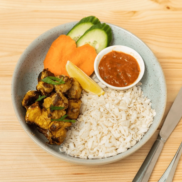 (Marinated overnight with a Nepalese aromatic herbs and spices and then grilled to perfection; served with chiura (crunchy beaten rice), fresh slice of cucumber & carrot and side of sichuan, tomato & coriander chutney)